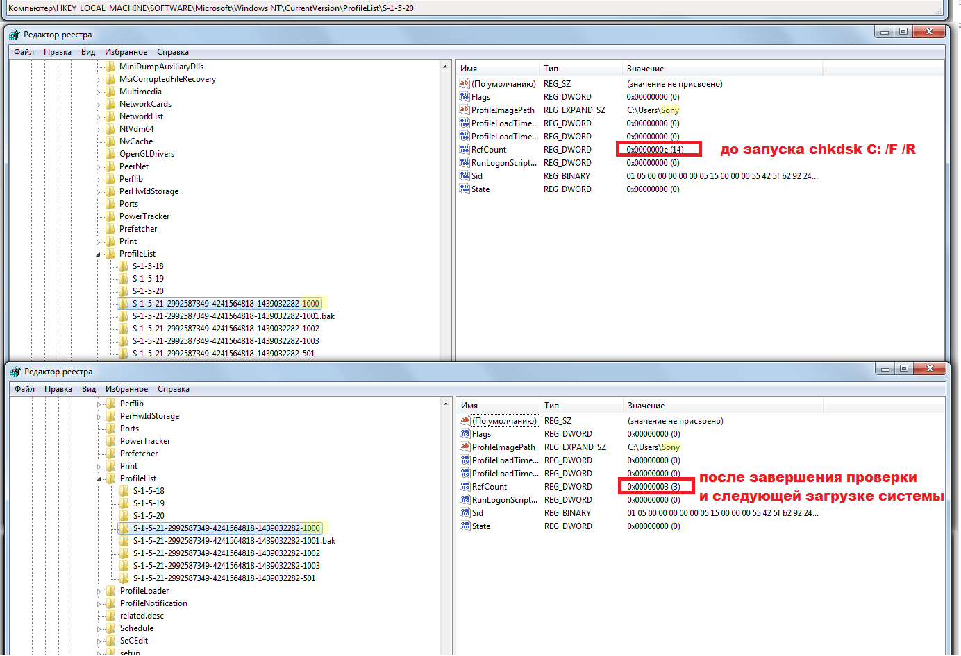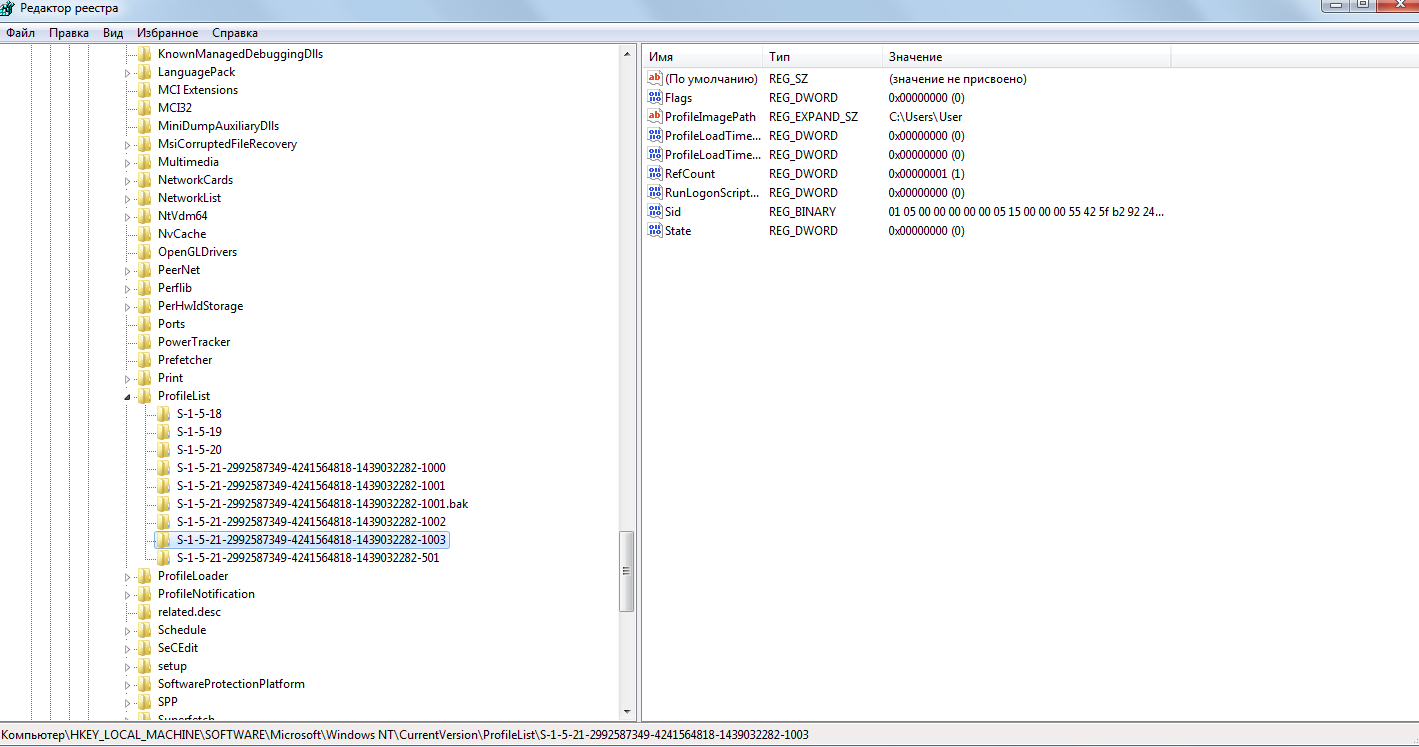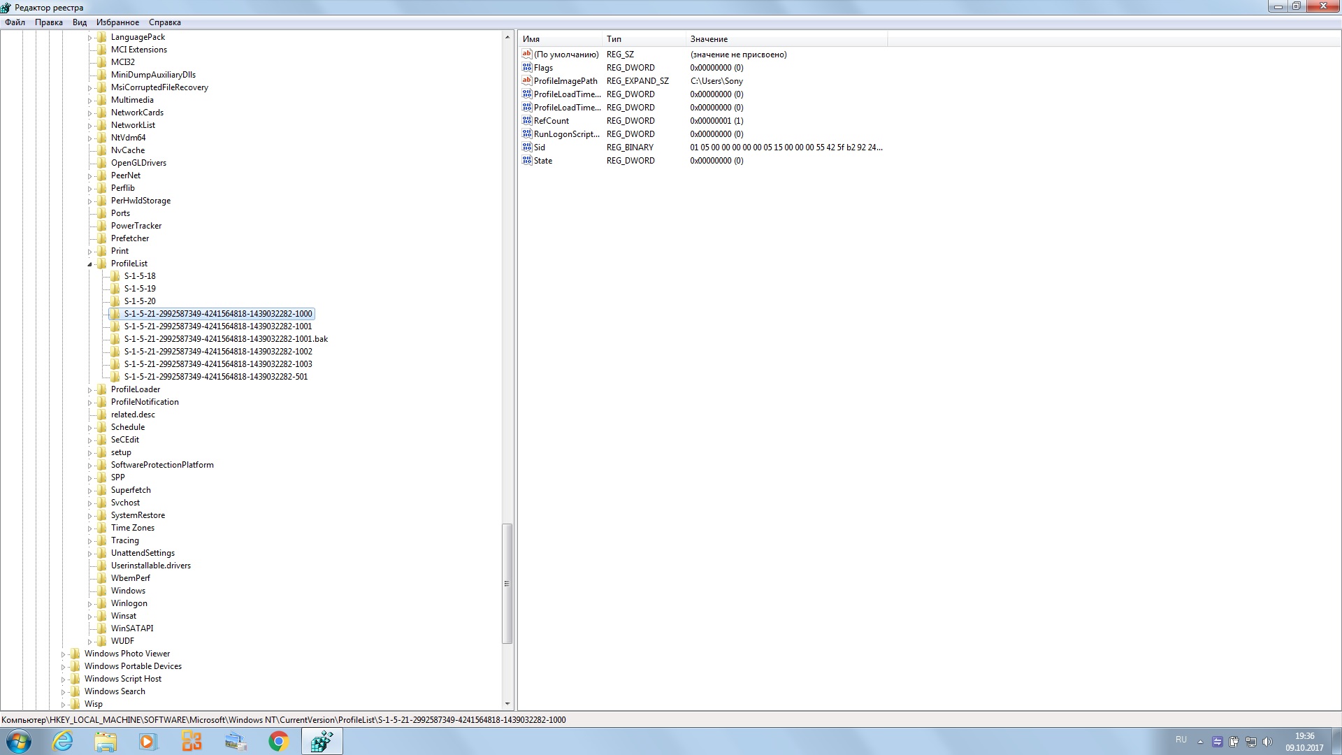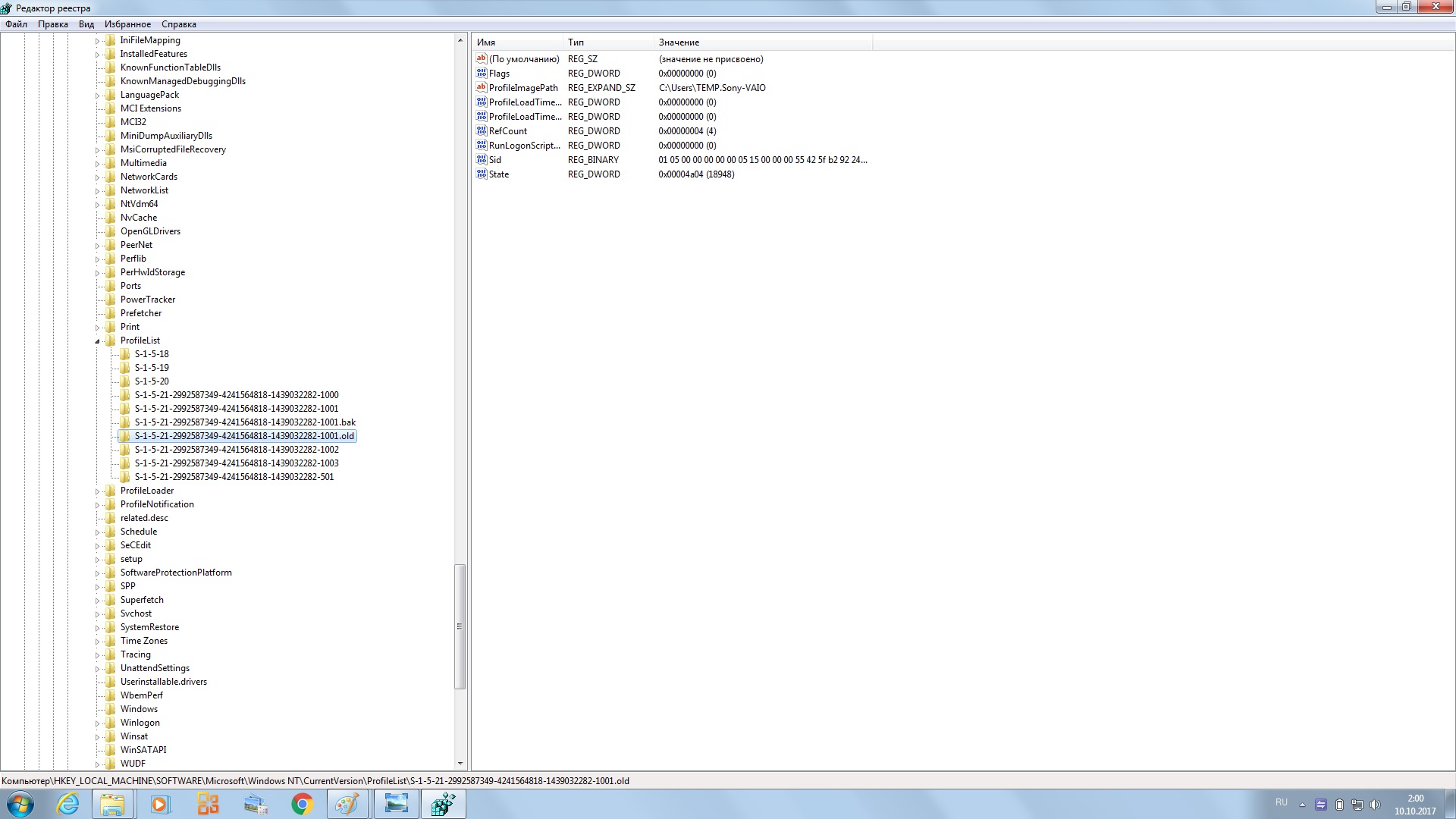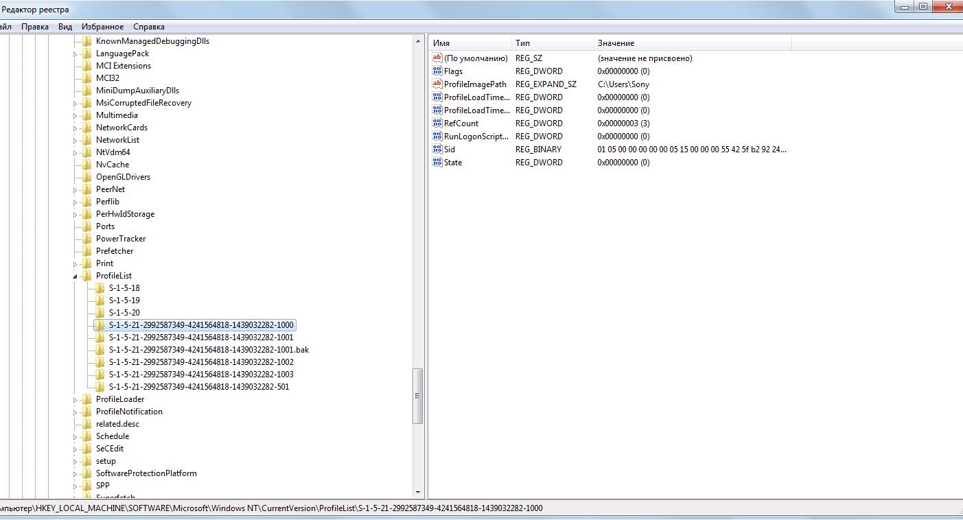 Хотя по идее он тоже вроде как должен быть ? (есть раздел 1000 но он относится к пользователю "Sony") И получается если я удалю у раздела 1001 его .bak то сделаю еще хуже ? В связи с этим вопросы 1) Как мне действовать в моей ситуации ? (Я на всякий случай создал точку восстановления и также экспортировал реестр - не знаю поможет ли это в случае чего) 2) В случае ошибки (или полного удаления одного из разделов пользователя) я смогу восстановить его обратно со всеми файлами и папками, которые были на его на рабочем столе, импортировав файл рестра который сохранил? В общем как быть,что делать? И сначала нужно дописать в без .bak какую-нибудь цифру, затем стереть в нужной .bak Потом переименовать предыдущую стерев дописанную цифру и сразу же введя .bak. p.s. прилагаю скрины с "реестра" profilelist Скрытый текст