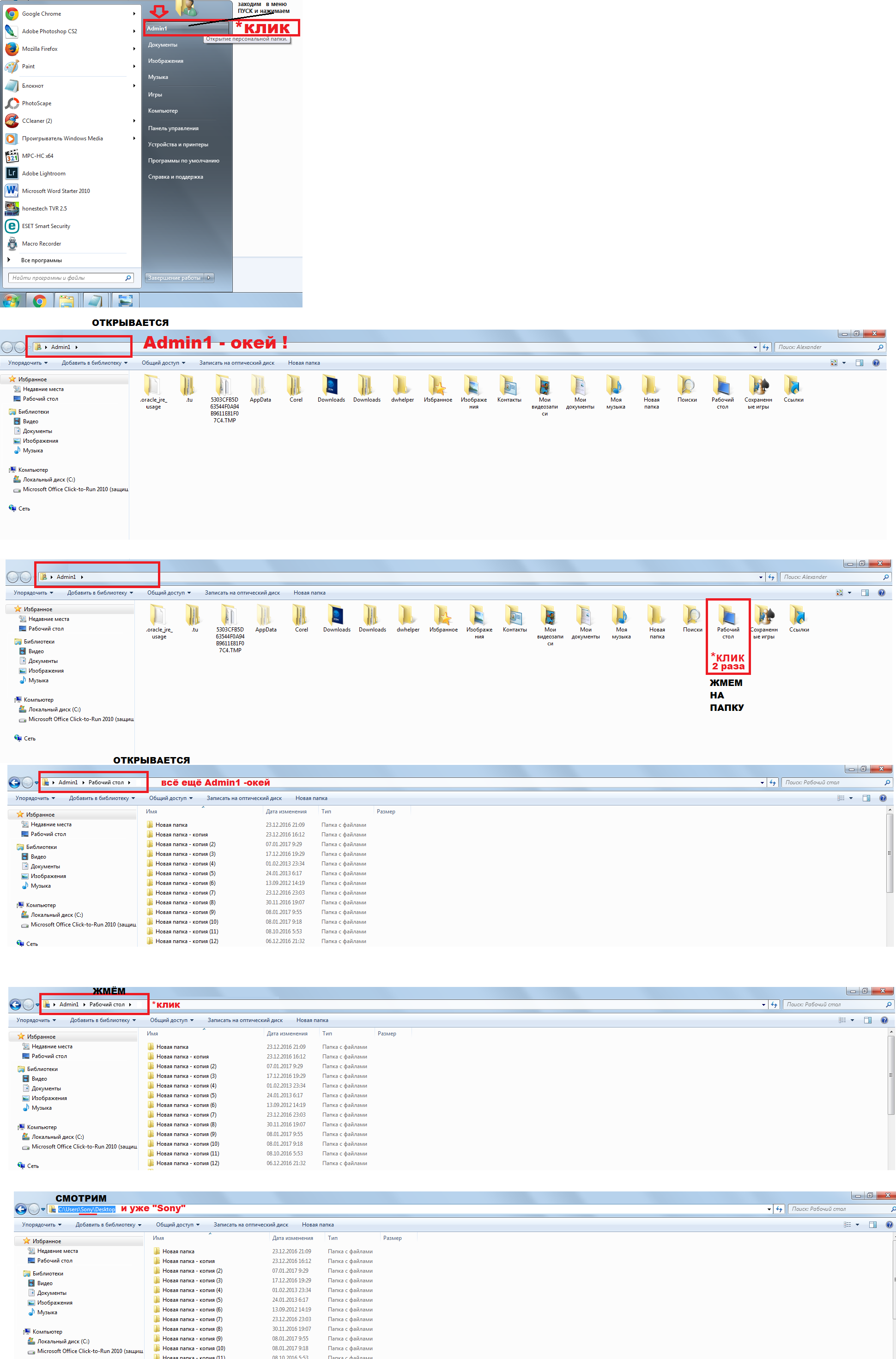 Захожу в меню "Пуск" там в верхнем правом углу пользователь "Admin1" нажимаю на него открывается папка Admin1 и в верхней строке (там где обычно адрес папки тоже надпись Admin1 ) причем если хочу узнать расположение этой папки нажав на эту строку то все равно полный адрес этой папки не дает - так и пишется в этой строке Admin1 , чтобы все таки узнать адрес этой папки беру и нажимаю "свойства" у любой папки которая находится в ней и так узнаю что адрес папки C:\Users\Sony т.е. уже это пользователь Sony а не Admin1 .Как так ? причем если ввести адрес вручную C:\Users\Sony\Desktop и нажать enter то рабочий стол открывается а если ввести вручную C:\Users\Admin1\Desktop и нажать enter то выскакивает окно "не удается найти "C:\Users\Admin1\Desktop" проверьте правильyо ли написаны слова для поиска и повторите попытку" иначе говоря получается рабочего стола у пользователя Admin1 нет , хотя при загрузке системы именно на него я захожу а не на Sony - так как иконки пользователя Sony у меня нет при загрузке операционной системы. Я так понял Admin1 и Sony это один и тот же пользователь или как ? Посмотрите скриншоты там попытался наглядно изобразить вышеописанное |