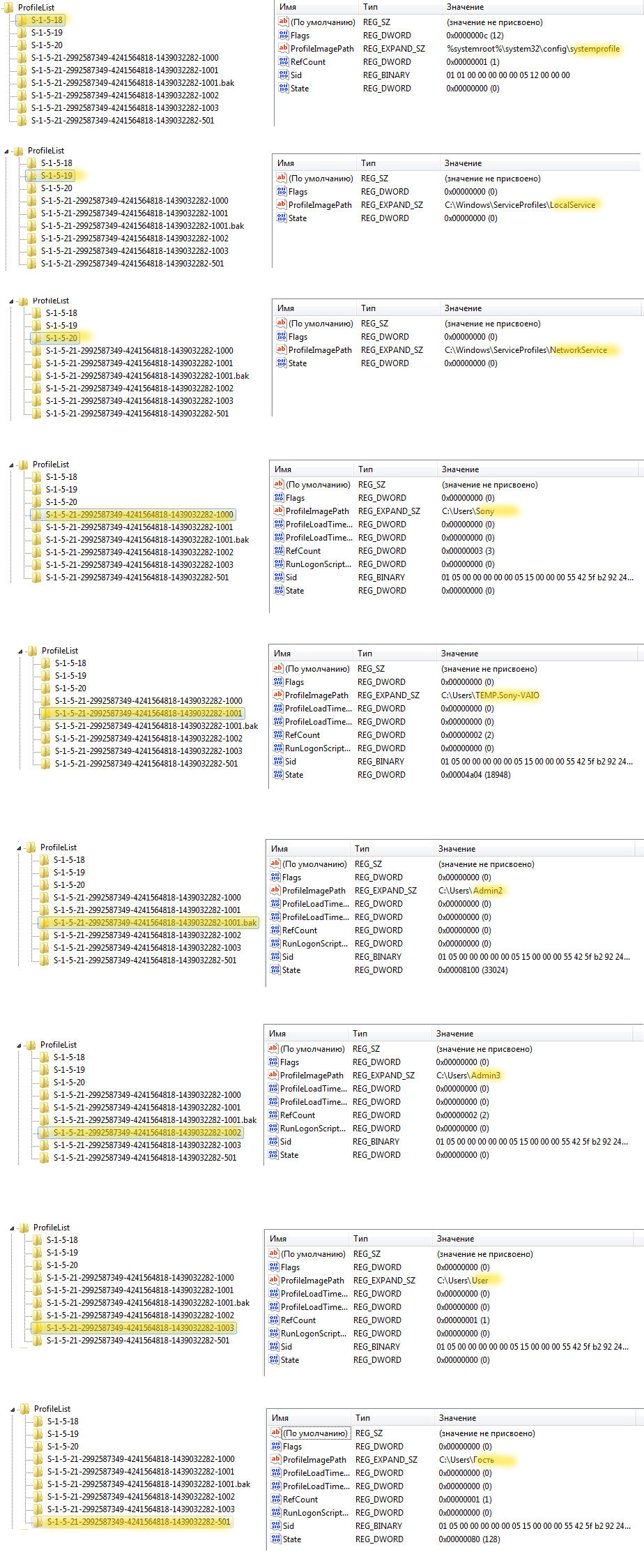 HKEY_LOCAL_MACHINE\SOFTWARE\Microsoft\Windows NT\CurrentVersion\ProfileList перечислите или сделайте скриншот |