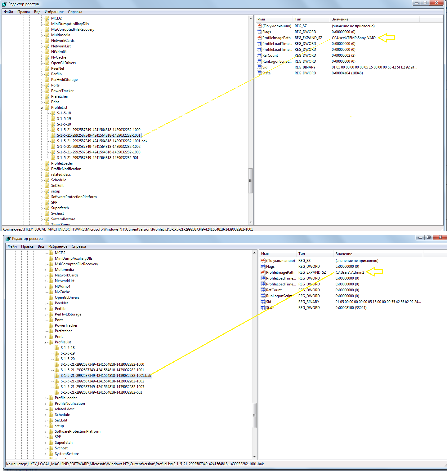 Возникла та же проблема. Вход с систему выполнен с временным профилем и т.д. Я нашел в реестре эту ветку. У меня нет в конце bак у меня HKEY_LOCAL_MACHINE\SOFTWARE\Microsoft\Windows NT\CurrentVersion\ProfileList\S-1-5-21-1257579750-2787037177-3363869478-500 и \S-1-5-21-1257579750-2787037177-3363869478-1000 МНЕ удалить можно какой профиль? О самой проблеме. При вкл компа рабочий стол не исчезает, а значки увеличены и половина программ отсутствует. В безопасный режим вхожу. Если несколько раз перезагрузить комп, то все восстанавливается. У меня было несколько учетных записей, я до этого их пытался удалить , но мешала (по моему) групповая политика. Я потом включал от имени администратора, потом отключал. Мне не мешали эти учетные записи. То есть у меня было три учетных записи. где 1000 соответствует С /user/ 123 , где 500 C / user / администратор, и был 501 соответствовал C /user / гость . Я сейчас удалил гость (501), но было написано не удается удалить, но исчезла сама запись из реестра . Я хочу удалить где 1000 ,но написано администратор. В общем в реестр влез , а дальше боюсь . Профиль пользователя 123 - 1,79 гб ,а профиль админ всего 2 ,74 мб . Запутался, какой профиль мой, какой основной, какой от имени админа.