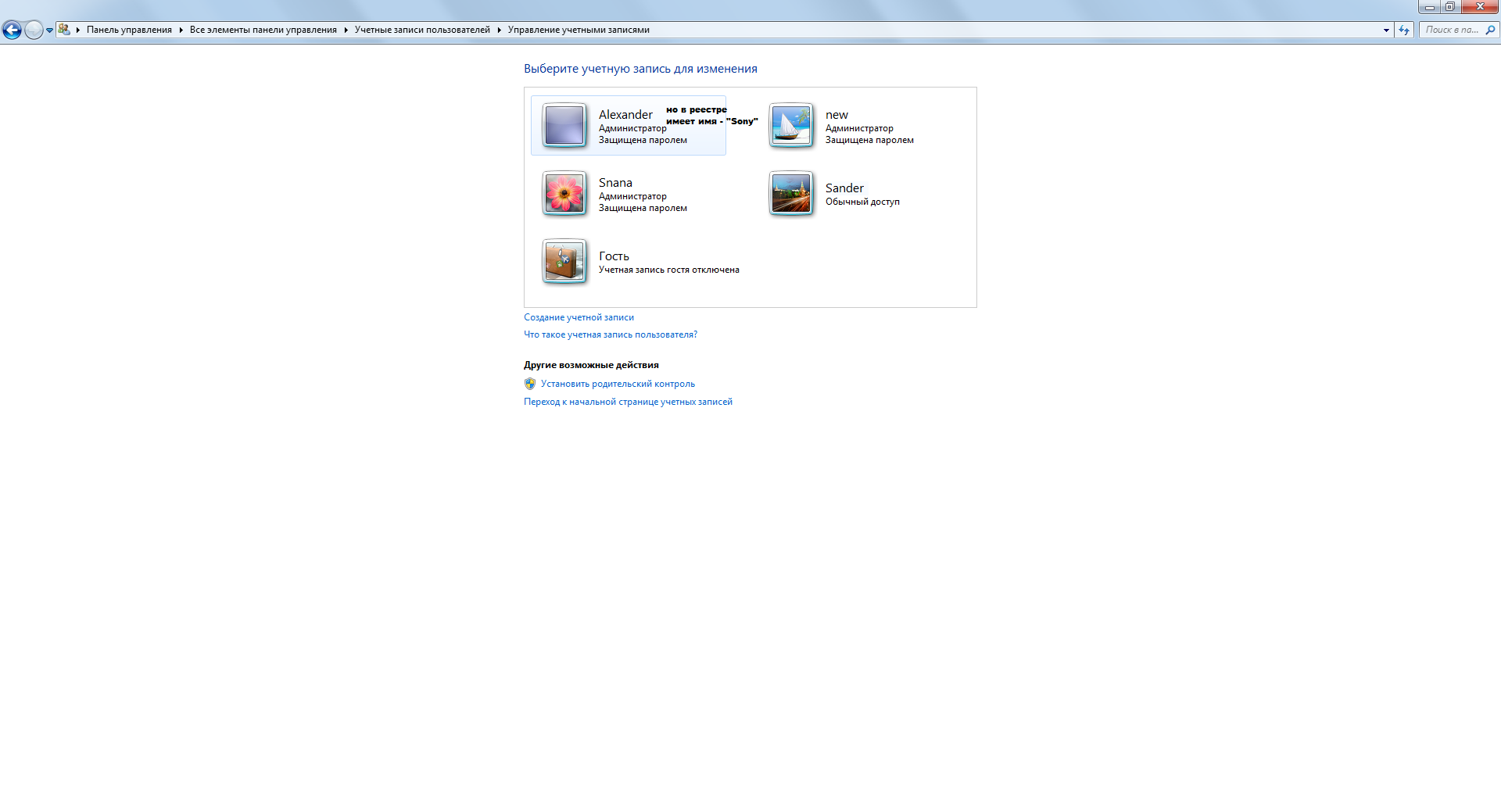 windows7 home basic x64 Есть компьютер на котором я имею 5 учётных записей пользователей. Все учётки мои. их имена : new - администратор .защищена паролем Sony -администратор .защищена паролем Snena - администратор .защищена паролем Sander - обычный доступ гость - учётная запись гостя отключена Скрытый текст