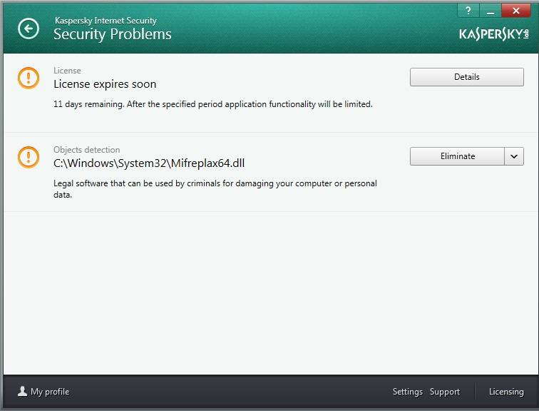 Касперcкий не может удалить ...\System32\Mifreplax64.dll