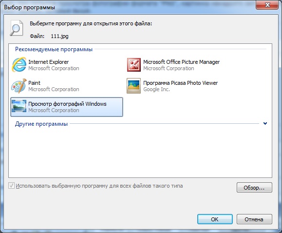Щелкните по любой фотографии правой кнопкой мыши. В последнем пункте выпавшего меню выберите "Свойства". Там в типе файлов "Приложения:" нажмите "Изменить". Выберите одну из выпавших рекомендуемых программ для просмотра, лучше стандартную: